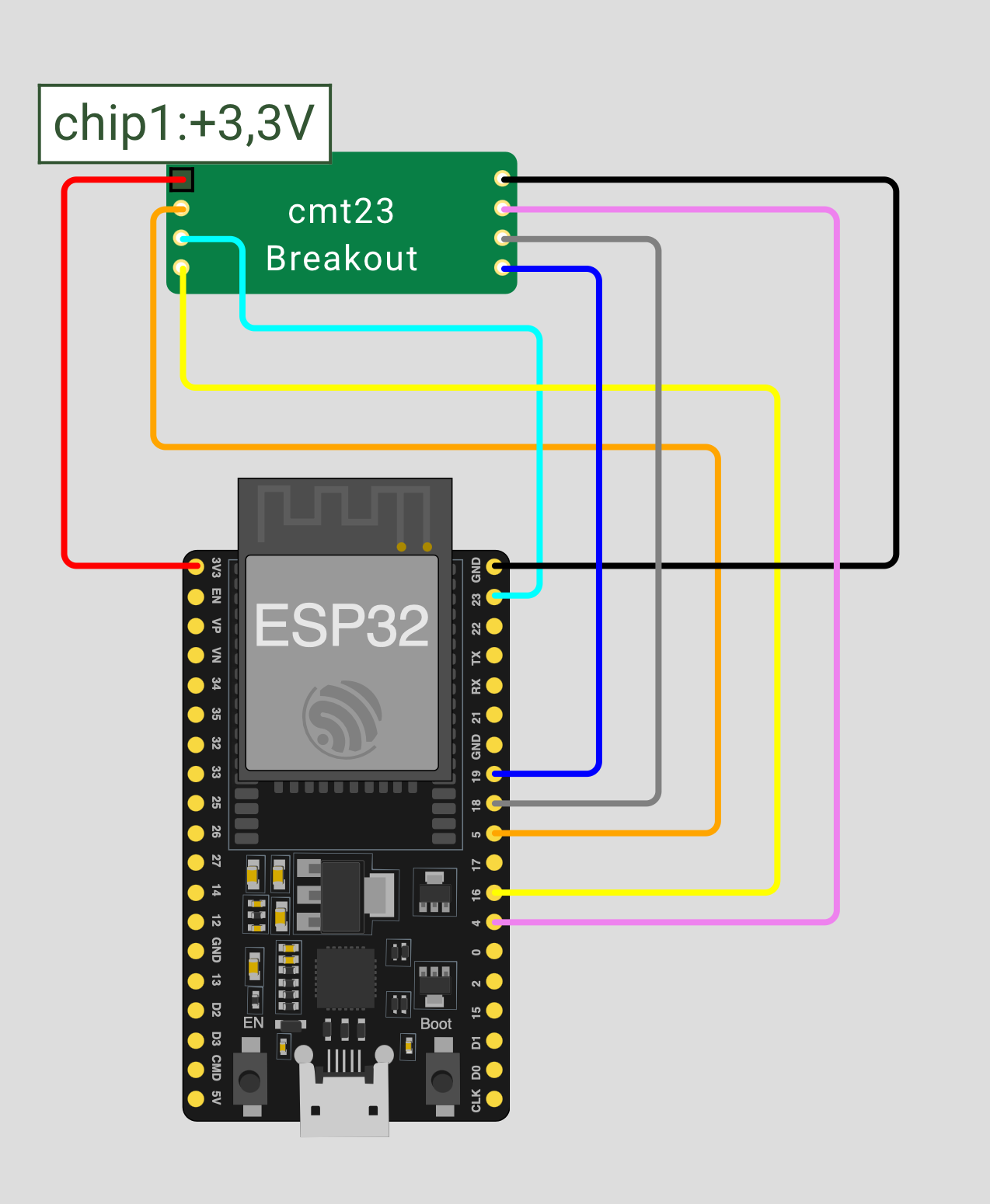 Das Bild ist mit https://wokwi.com erstellt. Der CMT23 ist hier als Chip dargestellt, es geht mir hier hauptsächlich um die Pins, oben links ist +3,3V und oben rechts GND, basierend auf der Platine von blinky parts. Damit sollte man es leicht verkabelt bekommen.